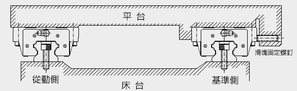 在無側(cè)向定位裝配面的安裝例中為確保從動(dòng)側(cè)導(dǎo)軌與基準(zhǔn)側(cè)導(dǎo)軌間的平行度,導(dǎo)軌可依下列所示安裝,而滑塊的安裝則與前述范例相同。