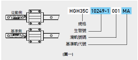 2. 確認(rèn)基準(zhǔn)軌與從動(dòng)軌:當(dāng)非互換型直線導(dǎo)軌配對使用時(shí),需注意基準(zhǔn)軌與從動(dòng)軌之差異。基準(zhǔn)軌側(cè)邊基準(zhǔn)面精度較從動(dòng)軌高,可作為床臺安裝承靠面。基準(zhǔn)軌上有刻上MA之記號。而且,雙軌配對使用時(shí),基準(zhǔn)軌編號為奇數(shù),而從動(dòng)軌之導(dǎo)軌編號為偶數(shù),安裝時(shí)請依照符號的指示,按順序進(jìn)行安裝(例如:001與002配對、003與004配對…),如圖一所示。如為多軌安裝,請以此類推。