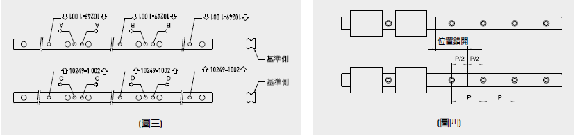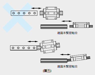 4. 導(dǎo)軌接牙件:導(dǎo)軌接牙安裝時(shí)必須依照導(dǎo)軌上標(biāo)示順序安裝,以確保直線導(dǎo)軌精度。接牙標(biāo)幟在接牙端的上表面,請將相同接牙標(biāo)幟的兩端接在一起,如圖三所示。且建議配對之導(dǎo)軌接牙位置最好能錯(cuò)開,以避免床臺至接牙處因不同導(dǎo)軌差異而造成精度不良,如圖四所示。