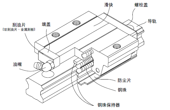 滾動循環(huán)系統(tǒng):滑塊、導軌、端蓋、鋼珠、鋼珠保持器