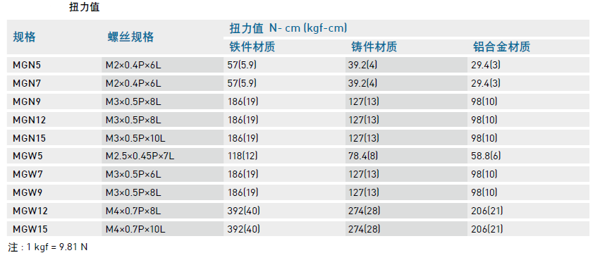 微型滾珠直線導軌MG系列安裝平面誤差對照表